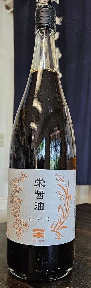 国産丸大豆をはじめとした精選された原料を使い、昔ながらの木桶にて一年半熟成させた天然醸造の濃口醤油です。広く何にでもご利用いただけます。「天然醸造」とは、1に本醸造であること、2に酵素の添加により酵素の促進を行っていないこと、3に保存料などの食品添加物を使用していないこと、の3点を満たした醤油造りのことを言います。 長い歴史の間にお蔵に棲みついた菌の助けを借りながらじっくりと時間をかけて熟成させることで、栄醤油特有の「味」・「色」・「香り」が生みだされるのです。醤油は空気に触れると酸化して、色が悪くなったり風味が落ちたりしてしまうので、開封前は冷暗所、開封後は冷蔵庫での保存がおすすめです。静岡県 遠州横須賀【名称】こいくち醤油【原材料】
